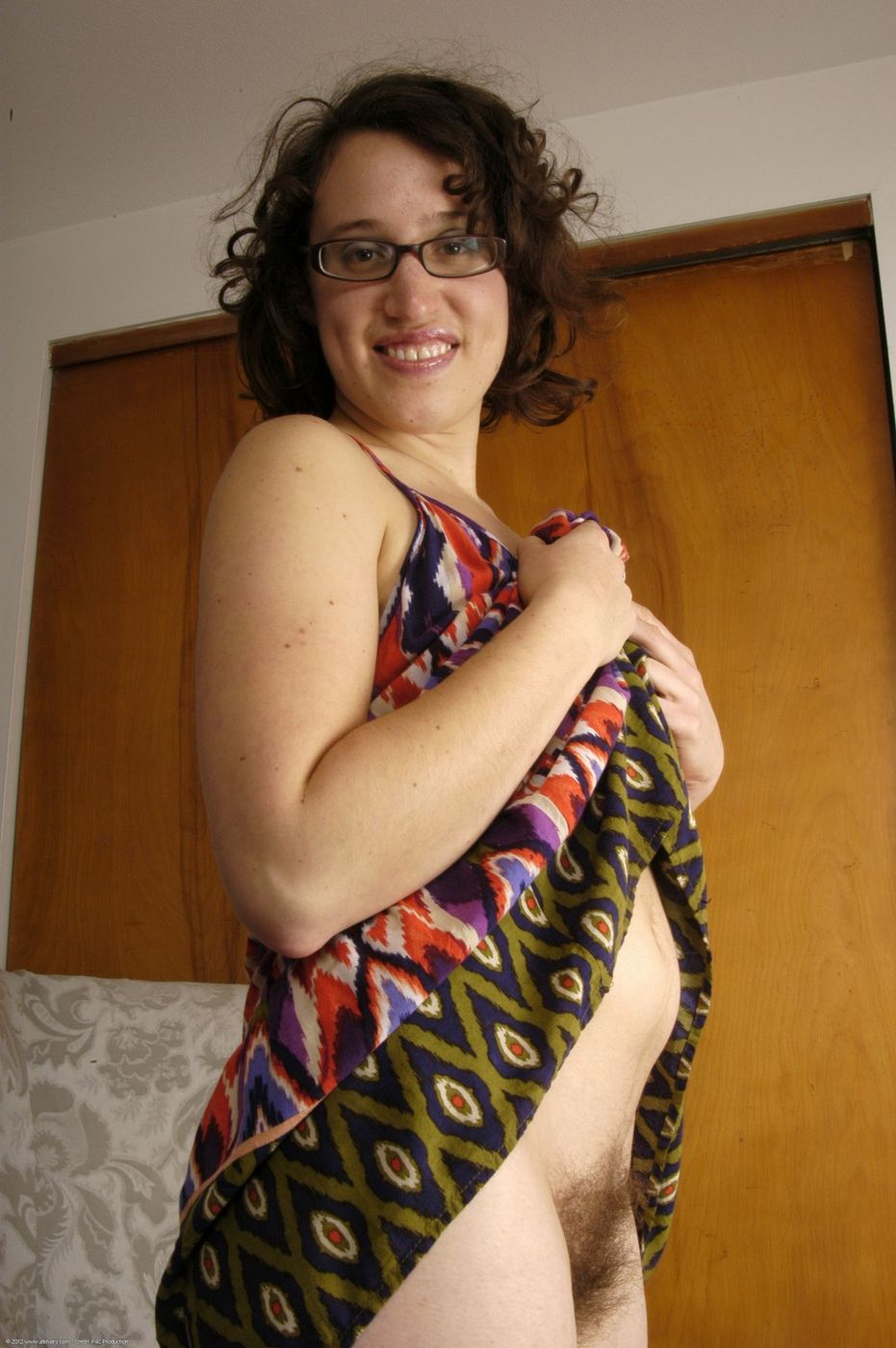 - Description: Hairy girl in glasses shows off her pussy